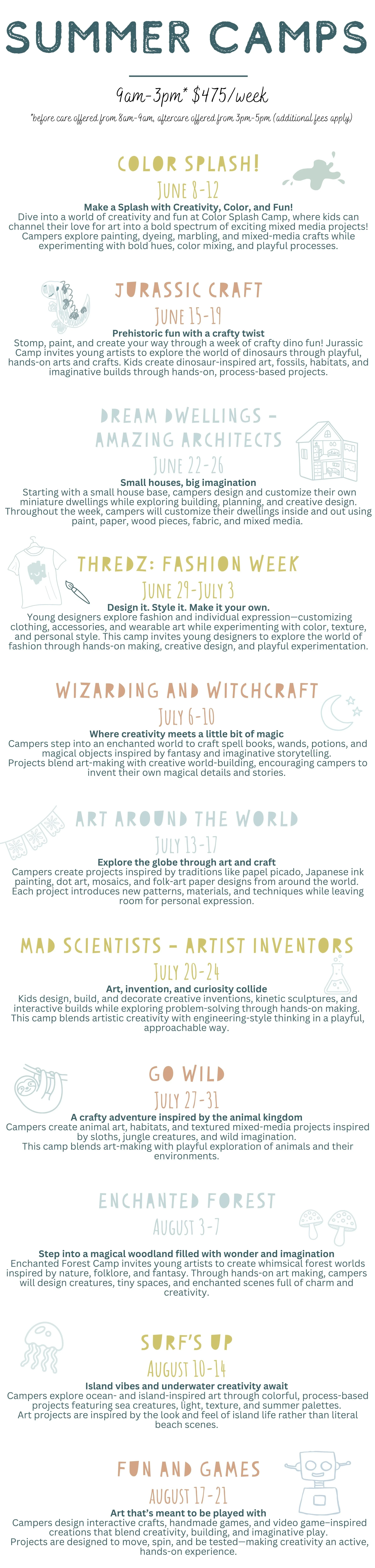 Our top priority is to provide a nurturing environment where kids can explore their creativity though art and play, make new friends and be their authentic selves. Each week brings a new theme with unique crafts and activities designed around that theme.
